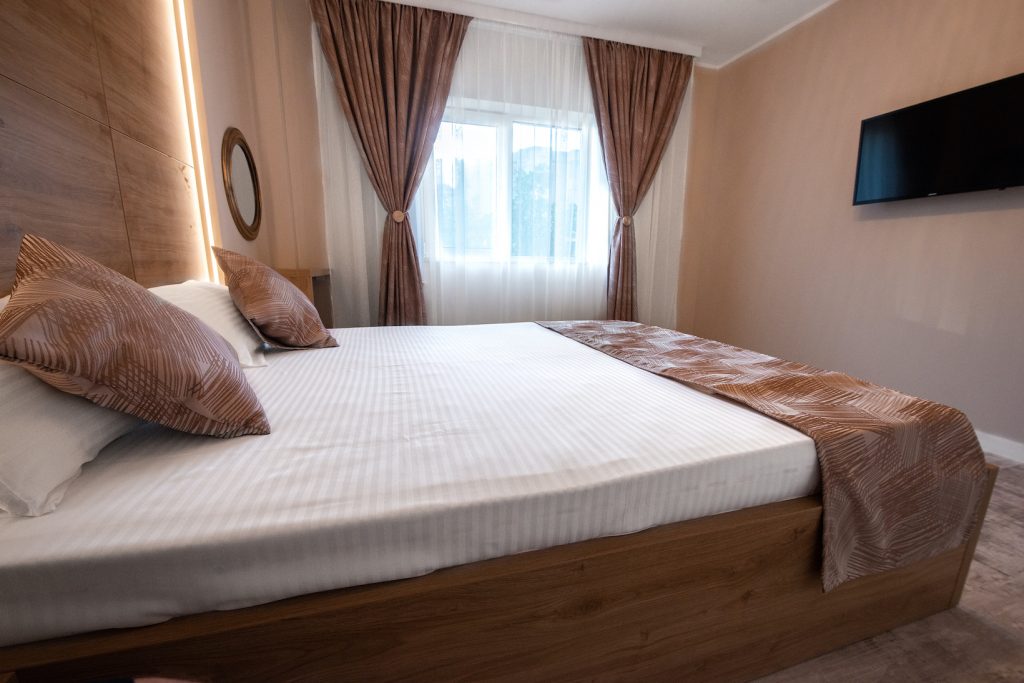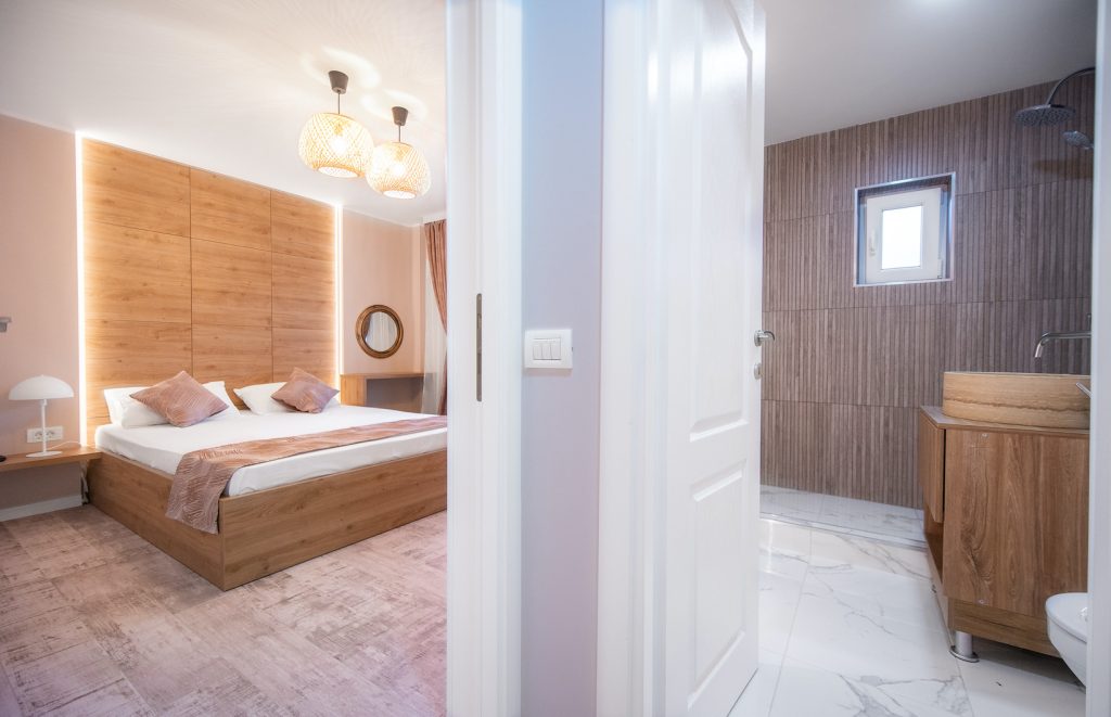 Zona de Noapte: Dispune de 2 dormitoare elegante, fiecare dotat cu pat matrimonial generos (160x200 cm) și saltele ergonomice pentru un somn odihnitor. Ambele camere includ Smart TV LED și acces la Wi-Fi de mare viteză.