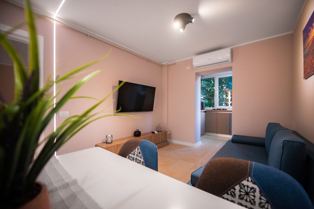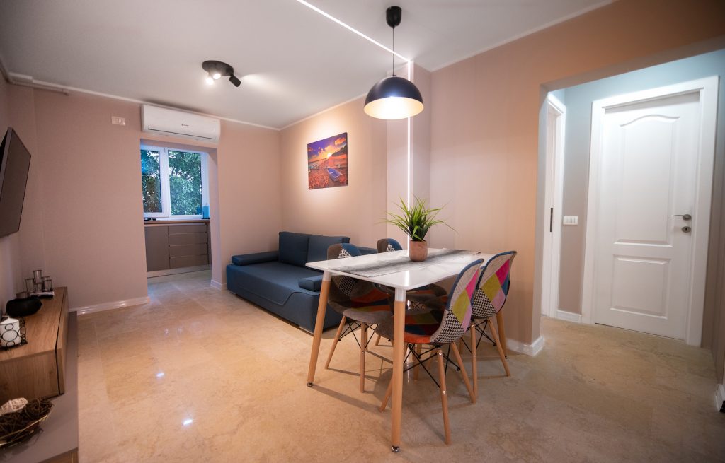 Living Open-Space: Un spațiu generos și luminos, ideal pentru socializare, dotat cu o canapea extensibilă confortabilă, TV LED și sistem de aer condiționat performant.